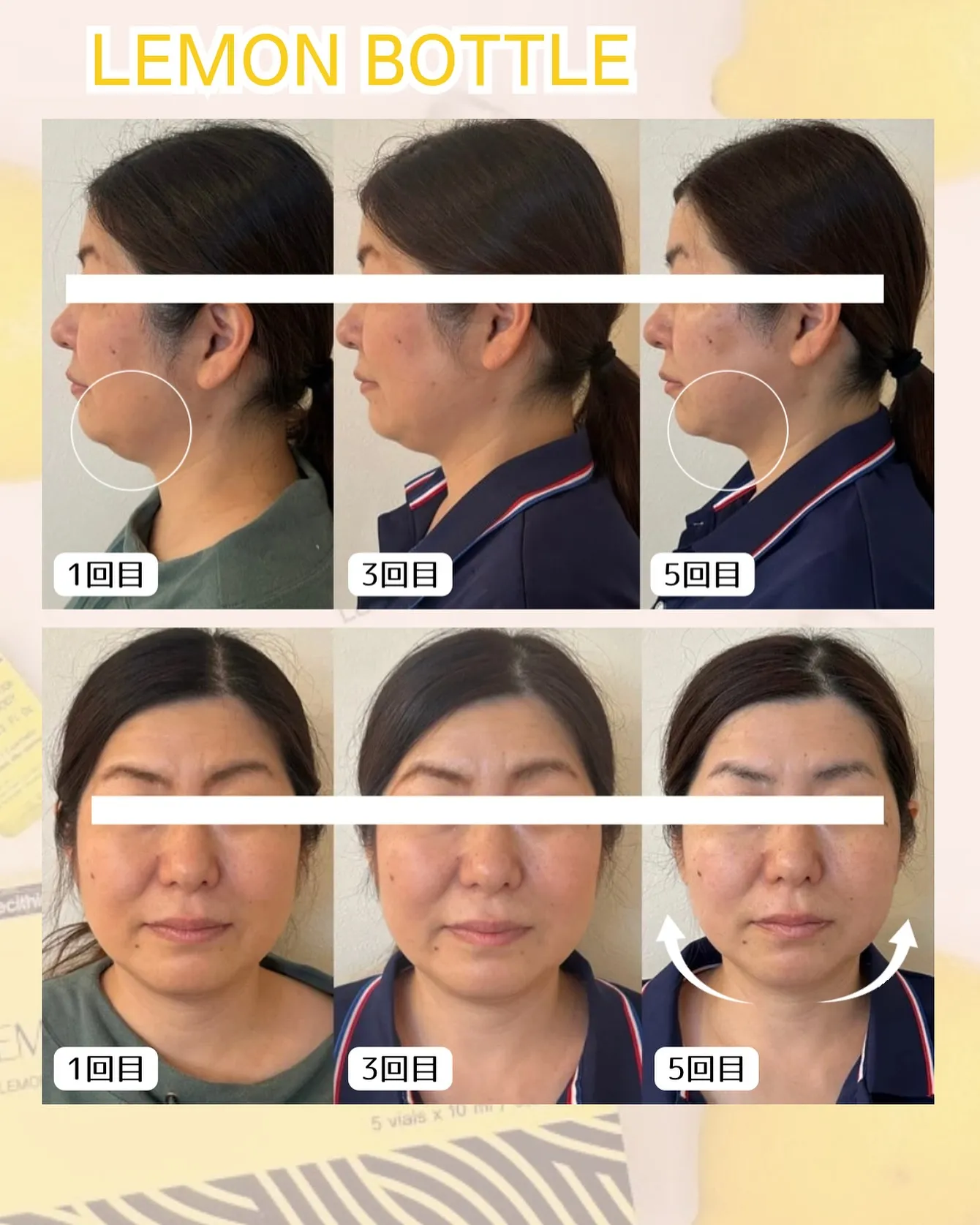 【症例紹介:LEMON BOTTLE】 【症例紹介:LEMONBOTTLE】▶施術内容:レモンボトル(脂肪溶解)▶施術部位:フェイスライン・顎下・法令線横📌経過写真(1回目→3回目→5回目)🔹二重アゴの脂肪が減少し、フェイスラインが明確に🔹顎下のもた…